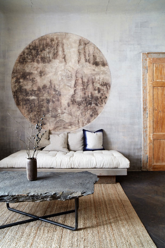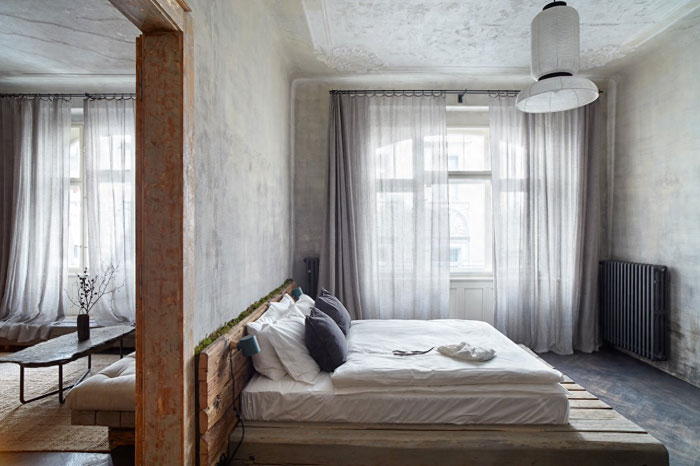 房屋老化,抹灰的墙面出现了泛黄发黑的问题,只做了简单的翻新处理,保留了旧公寓的味道,斑驳的墙面远看就像一幅意境悠长的壁画,且与一旁的窗帘相映成趣。